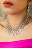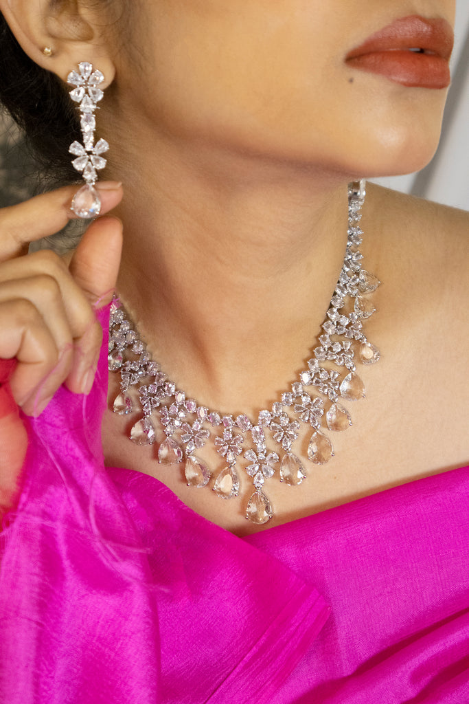 A dazzling choker set featuring intricate floral motifs and cascading teardrop crystals, paired with elegant matching earrings. Perfect for weddings, parties, and special occasions.